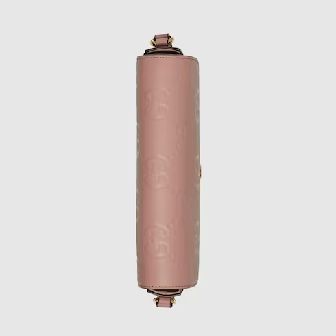 The initials of Founder Guccio Gucci continue to decorate leather accessories, connecting smaller contemporary pieces to Gucci's heritage. Here the emblematic GG motif plays on texture and a shiny finish to define this mini shoulder bag in a delicate shade of rose beige.