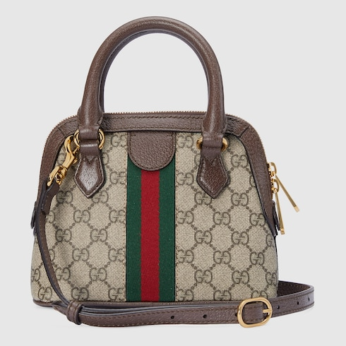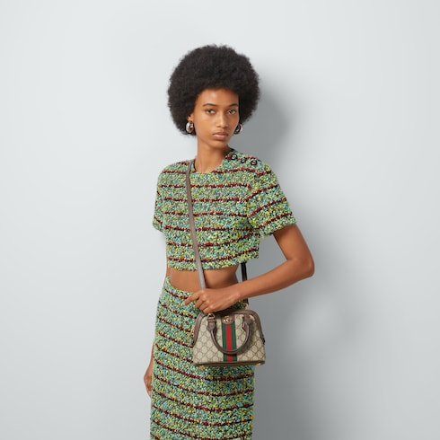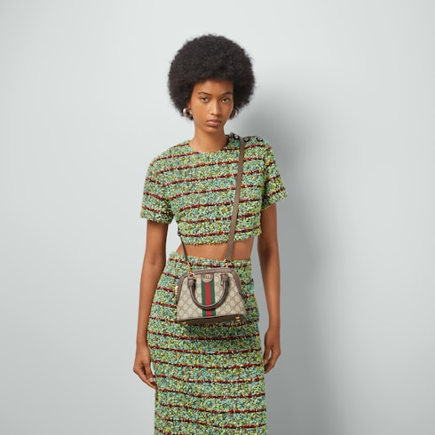 The Ophidia line is further elevated through new sizes and styles including a top handle mini version with double handle. This super mini bag appears as part of the line with well-known features such as the Web and Double G.