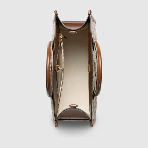 Inspired by the summer spirit and beach clubs on the Italian coast, this item is part of Gucci Lido. Designed in a structured shape, this small tote bag is crafted from GG Supreme canvas with brown leather trim, the small size double-handled silhouette has a top handle and shoulder strap.